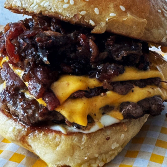 !00 gr de carne, queso, pepinillos, aros de cebolla y nuestra BBQ, incluye papas fritas.