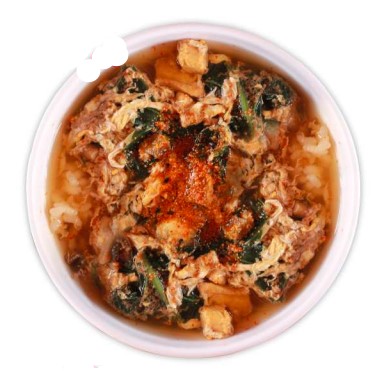 Orden individual, como la receta que nunca hizo mamá, sopa de pollo acompañado de champiñones, cebollín, huevo, espinaca, shichimi y una cama de arroz.