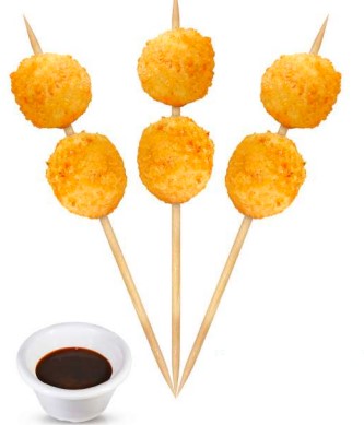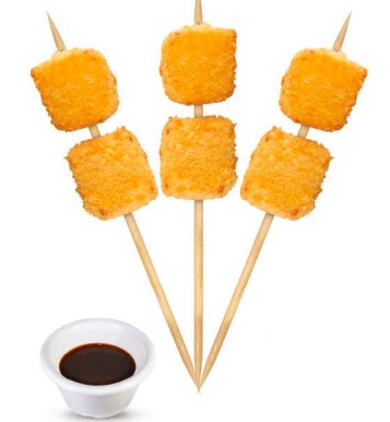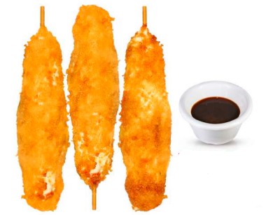 Orden con 3 brochetas, lo has probado, descubre su sabor crujiente, con relleno de queso manchego, acompañadas con aderezo kushiage.