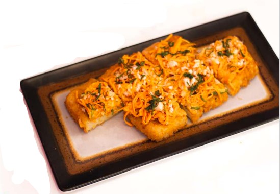 Orden de 10 pzas, por dentro manchego, mitad pollo y mitad bistec, por fuera alga salseado con chipotle.