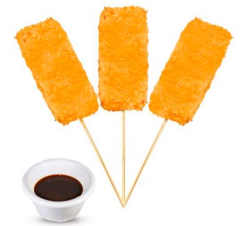 Orden con 3 brochetas, diversión y sabor crujiente, rellenas de surimi con Philadelphia, acompañadas de aderezo kushiage.