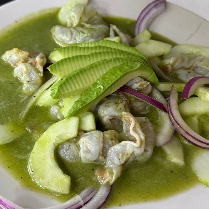 Delicioso aguachile de camarón fresco con pepino, limón y cebolla, bañado en agua de chiles verdes.