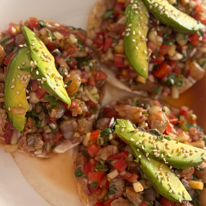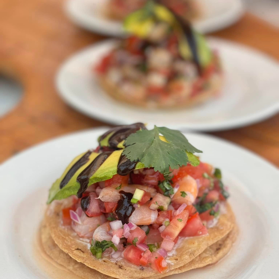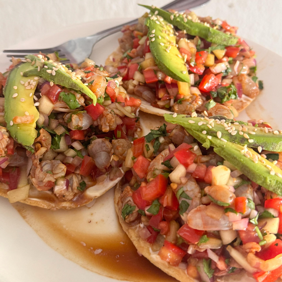 Orden de 3 tostadas de camarón y pescado con tomate, cilantro y el aderezo delicioso de la casa.