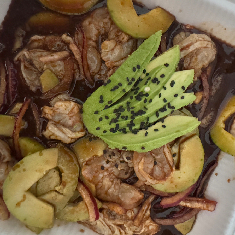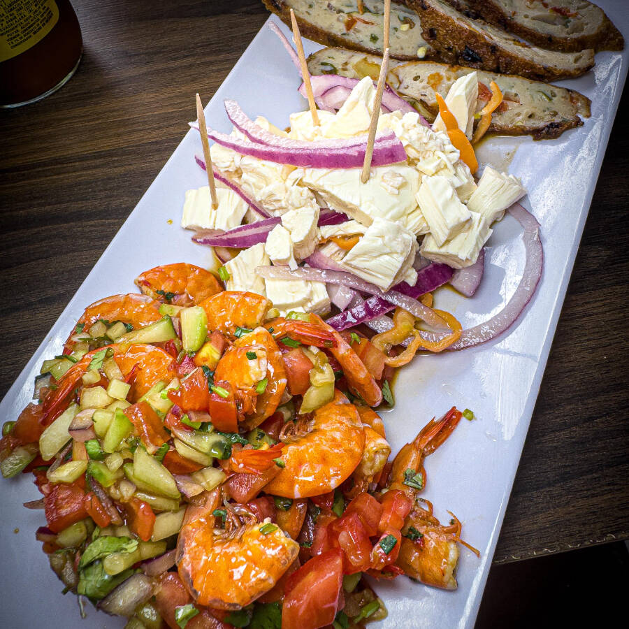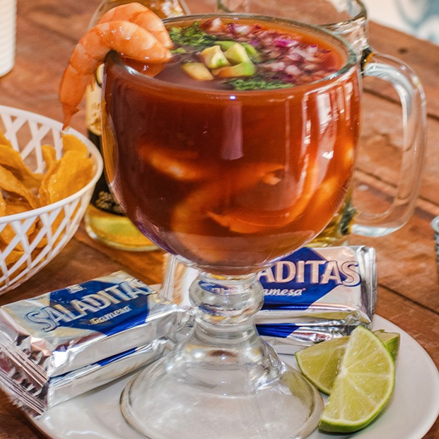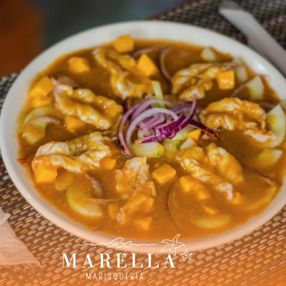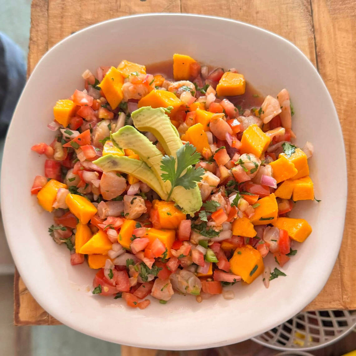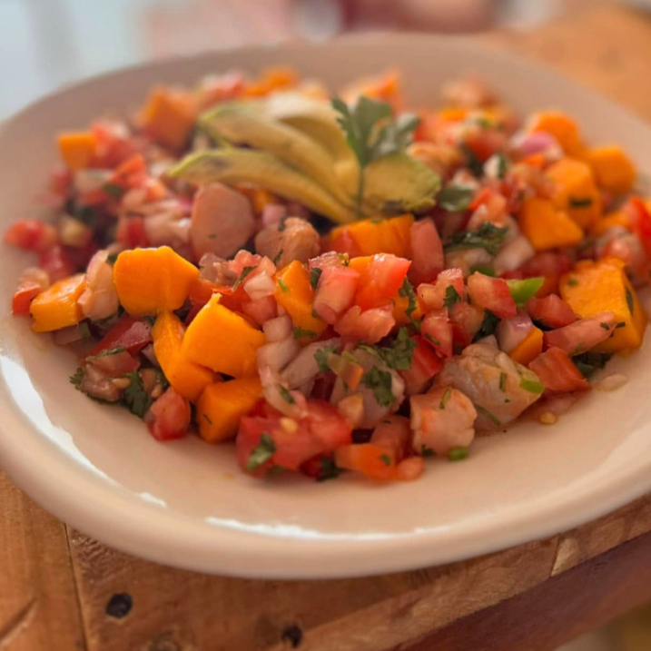 Deliciosa preparación de tomate, cebolla, cilantro, camarón y mango, bañada con nuestra mezcla de salsas y limón.