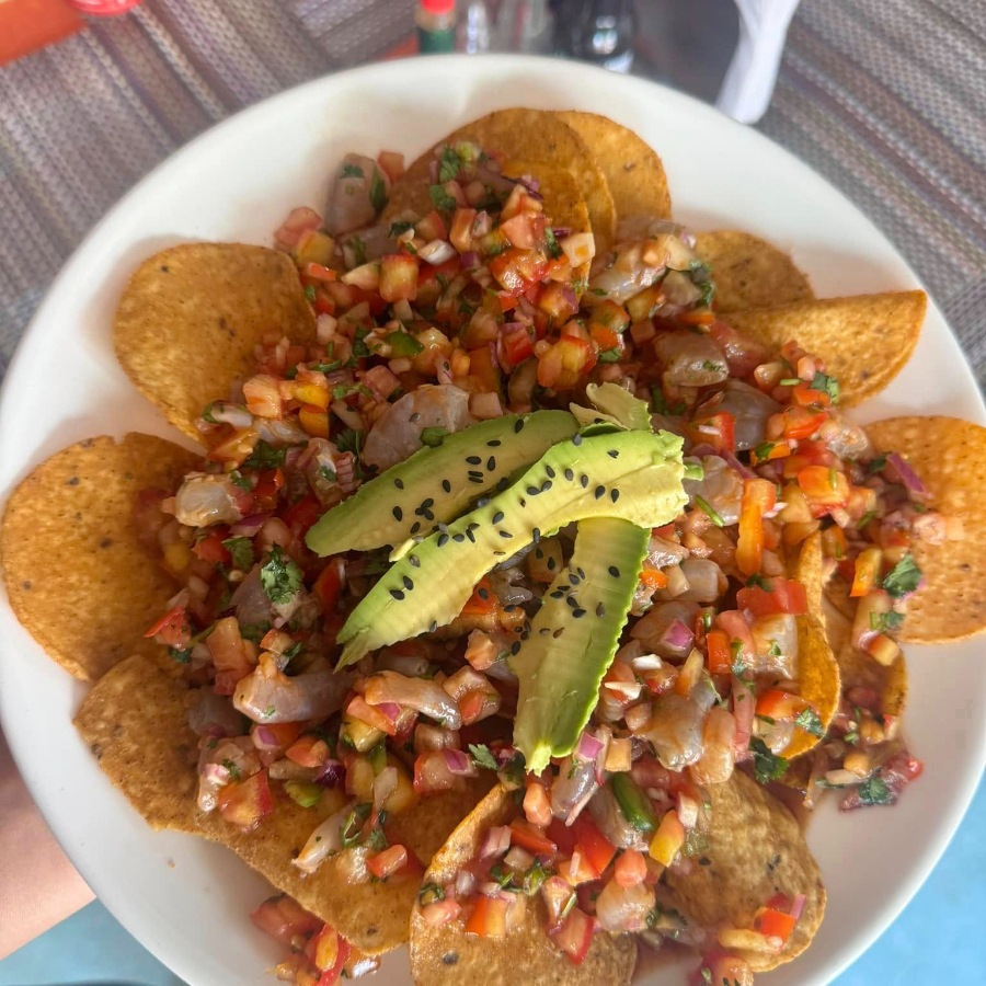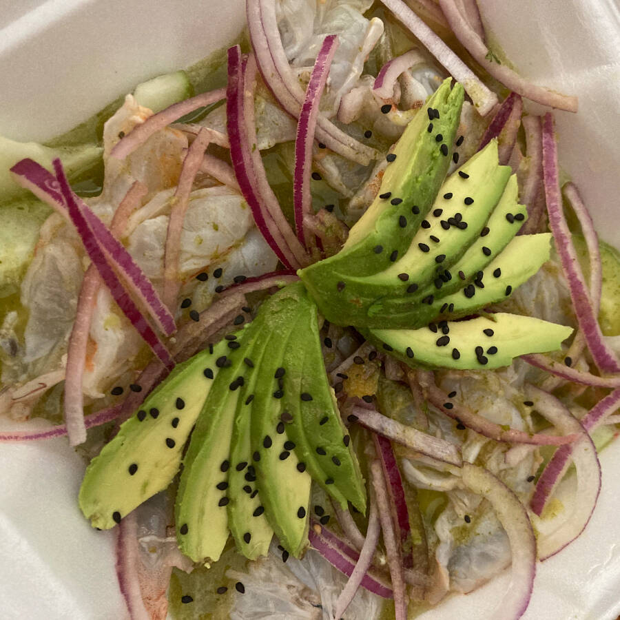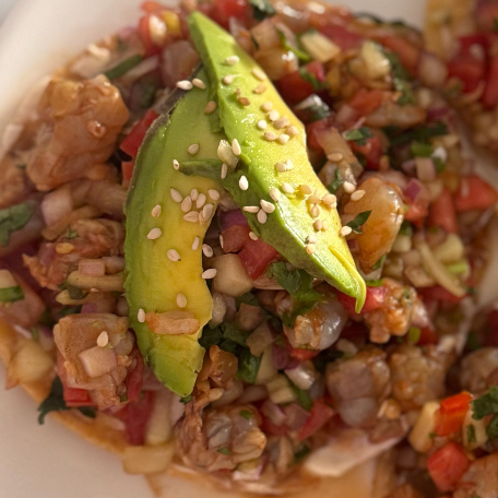 Deliciosa preparación de tomate, cebolla, cilantro, pescado y camarón, bañada con nuestra mezcla de salsas y limón.