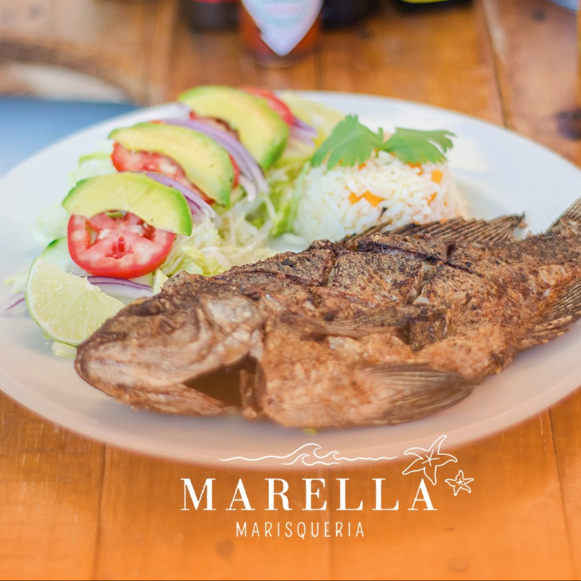 1 Pescado fresco preparado a la diabla con su ensalada fresca de lechuga y tomate.