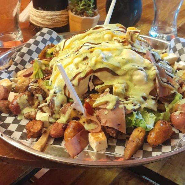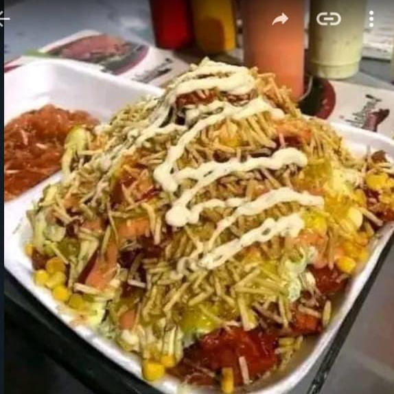 Pollo deshebrada, res dehcebrada, jamón tocineta, queso, vegetales, salsas de la casa, papas fosforitos