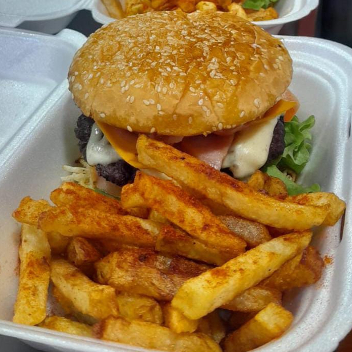 Carne 120 gr artesanal, jamón, lechuga fresca, tomate, cebolla caramelizadas, papas fosforitos