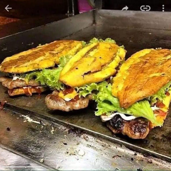 Es un platano macho estilo sandwich relleno de lechuga, tomates frescos, cebollas caramelizadas, jamon,queso, res asada