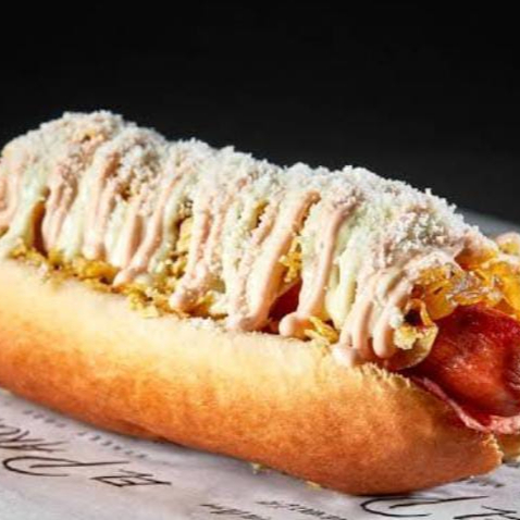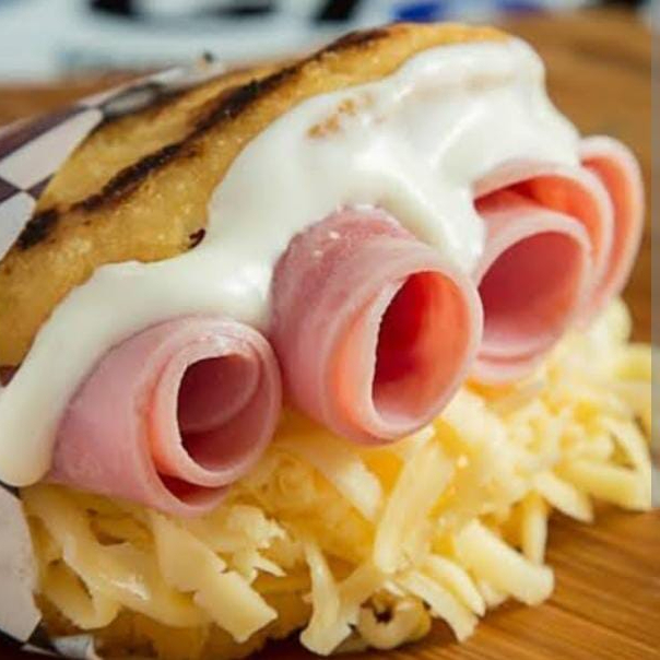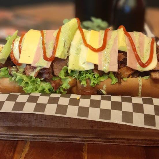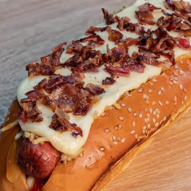 Carne 140 gr o pollo deshebrado, jamón queso, tocineta, lechuga, tomate cebolla, pepinillo, salsa de la casa, salsa fundida de queso 4 quesos, salchicha
