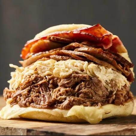 Es un platano macho estilo sandwich relleno de lechuga, tomates frescos, cebollas caramelizadas, jamon, queso, res deshebrada y puerco