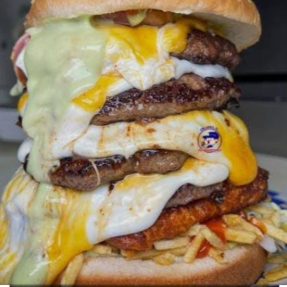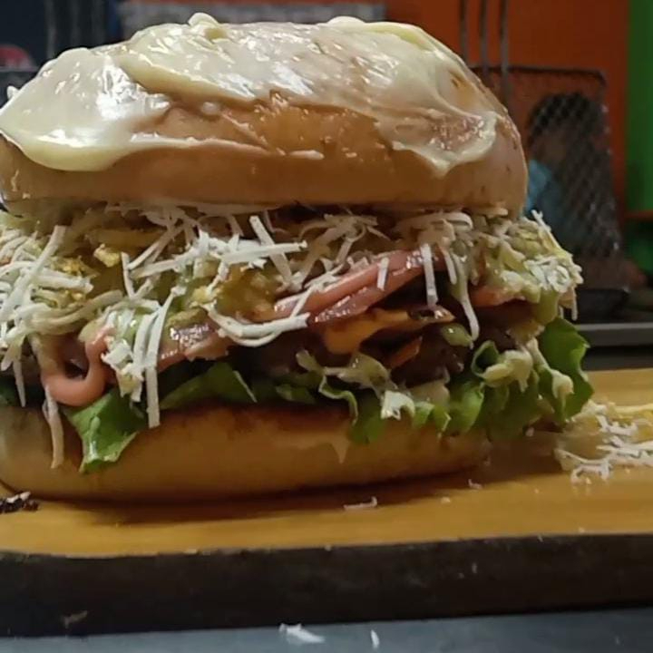 Carne 160 gr, jamón, queso, tocineta, lechuga, tomate, cebolla, pepinillo, salsa de la casa, salsa fundida de queso, 4 queso