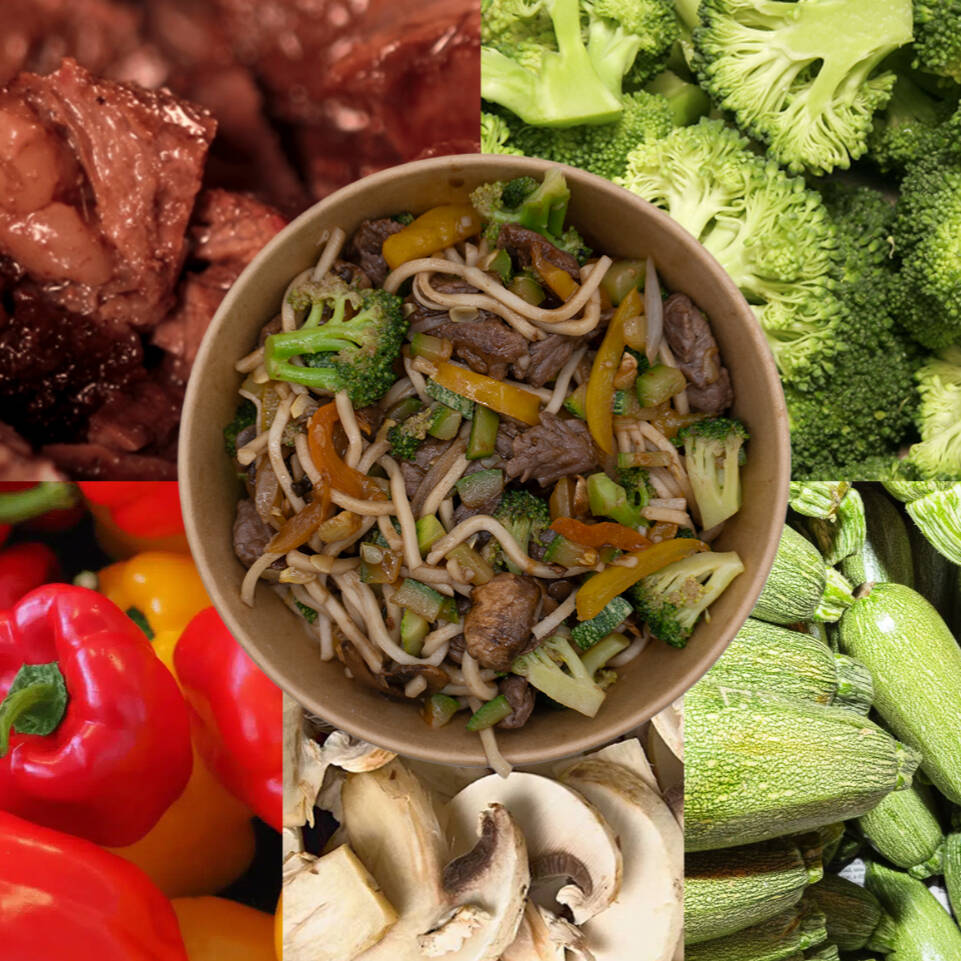 Noodles, arrachera, brócoli, pimiento, champiñones, calabaza, cebolla y cacahuate. (Aderezo: Cítrico habanero)