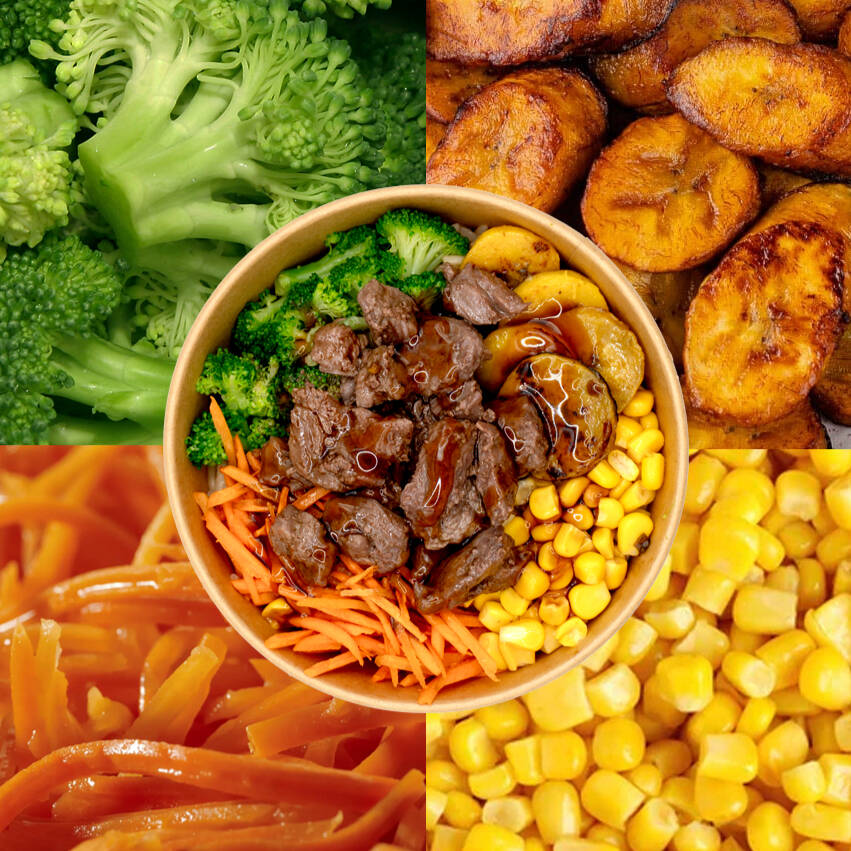 Arroz, noodles, arrachera, brócoli, zanahoria, elotitos y plátano macho. (Aderezo: Cítrico habanero y teriyaki)