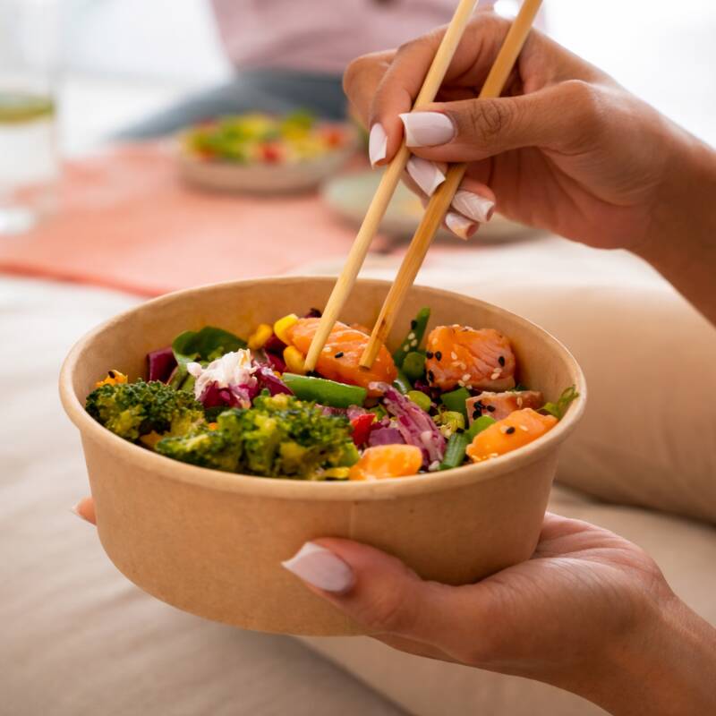 Arroz, pollo teriyaki, zanahoria, pepino, jícama, brócoli, aguacate y cacahuate. (Aderezo: Salsa soya y teriyaki)