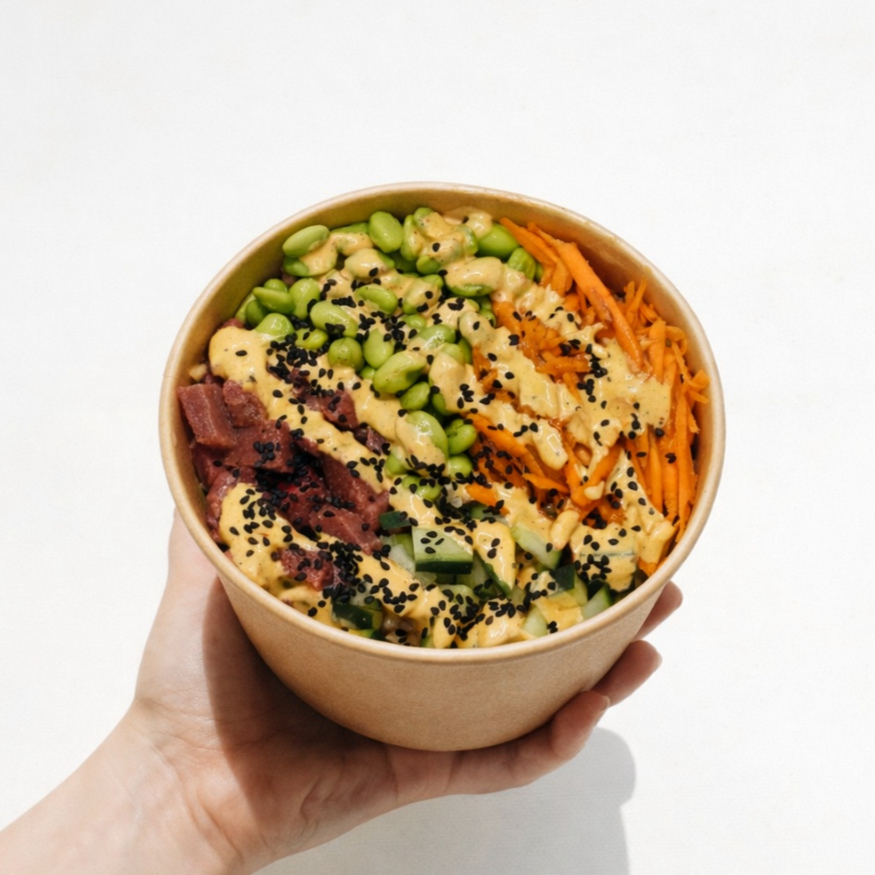 Arroz, atún marinado, alga nori, edamames, aguacate, ajonjolí y Philadelphia. (Aderezo: Salsa soya y chipotle)
