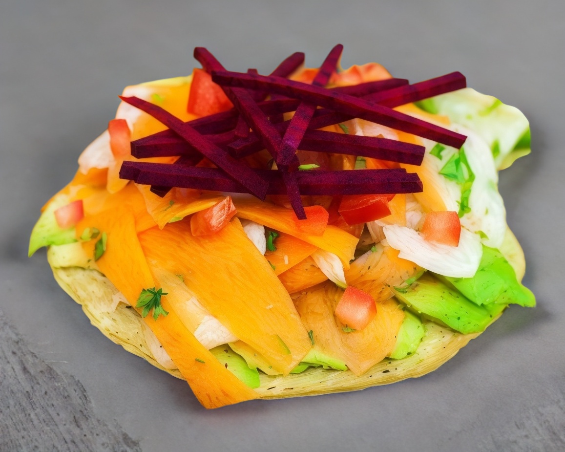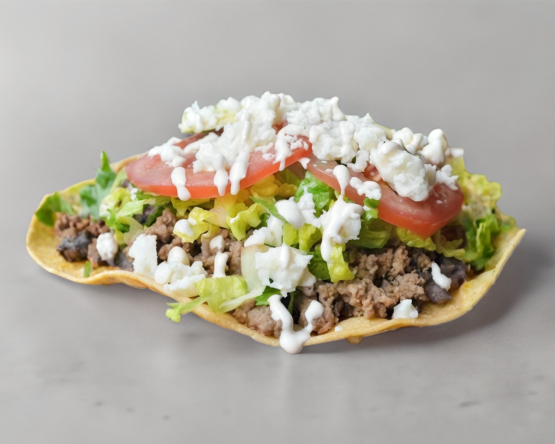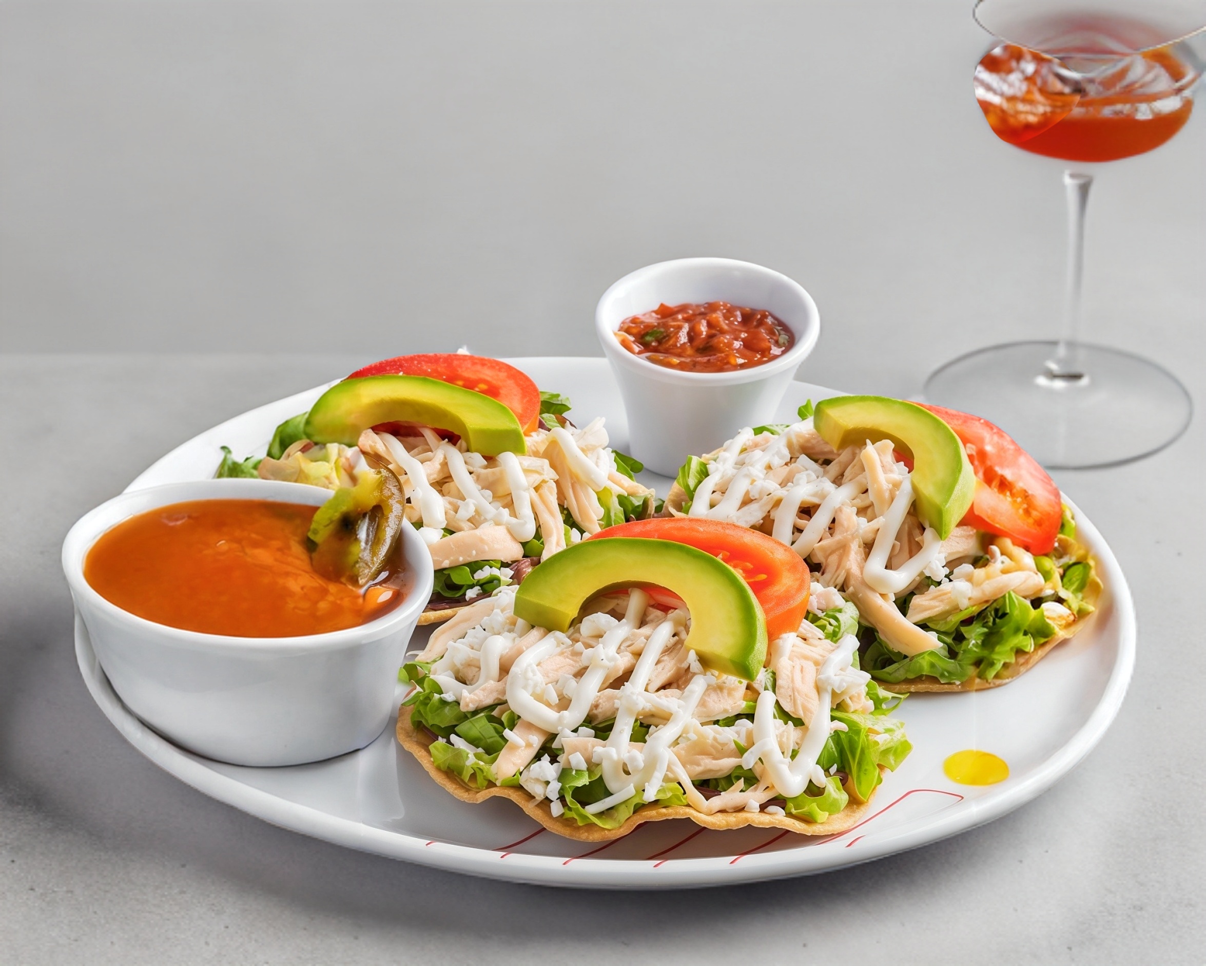 Exquisita tostada de pollo ( frijoles, lechuga fresca , pollo, betabel , zanahorias ,aguacate, chile en rajas , crema , queso y salsa roja)