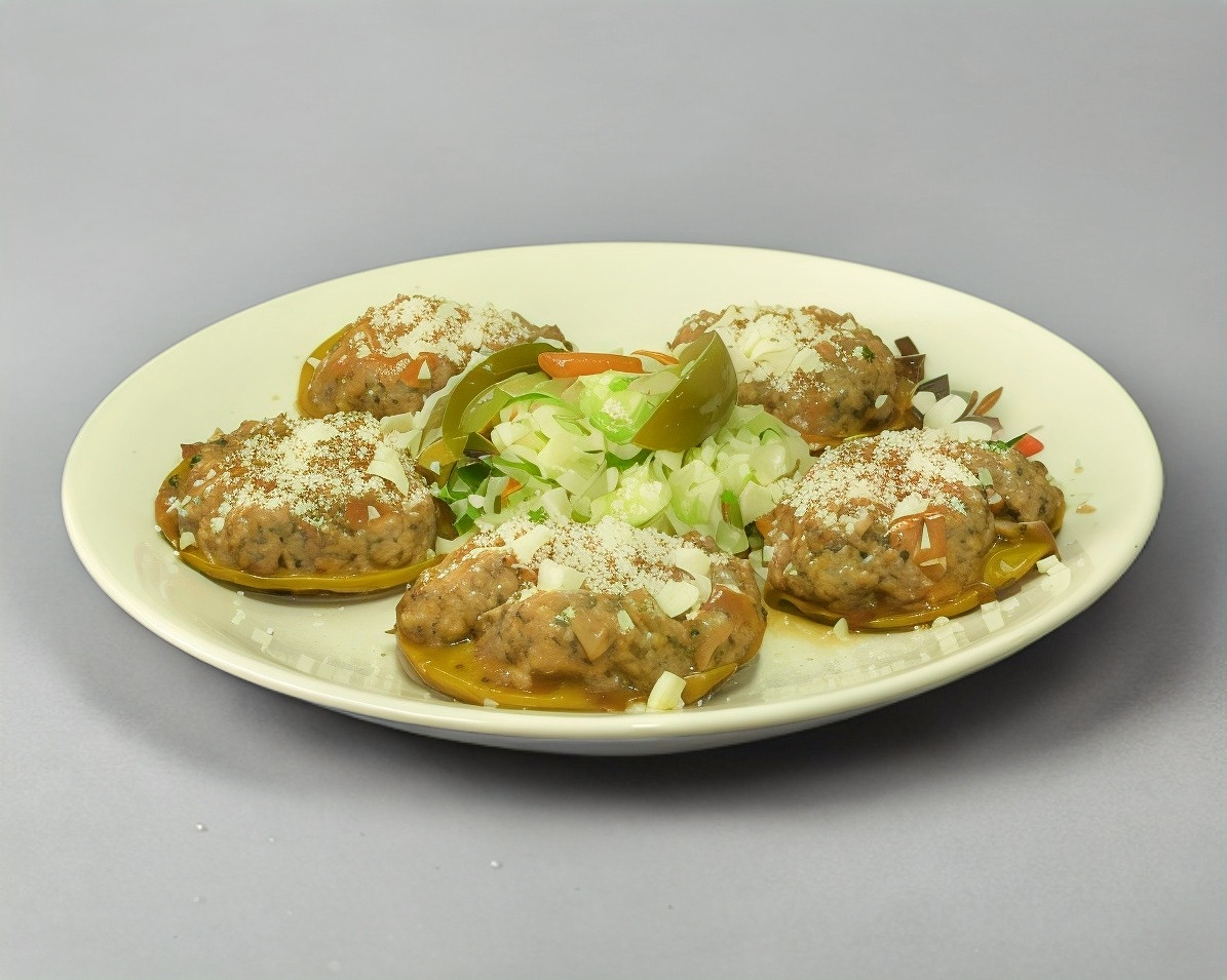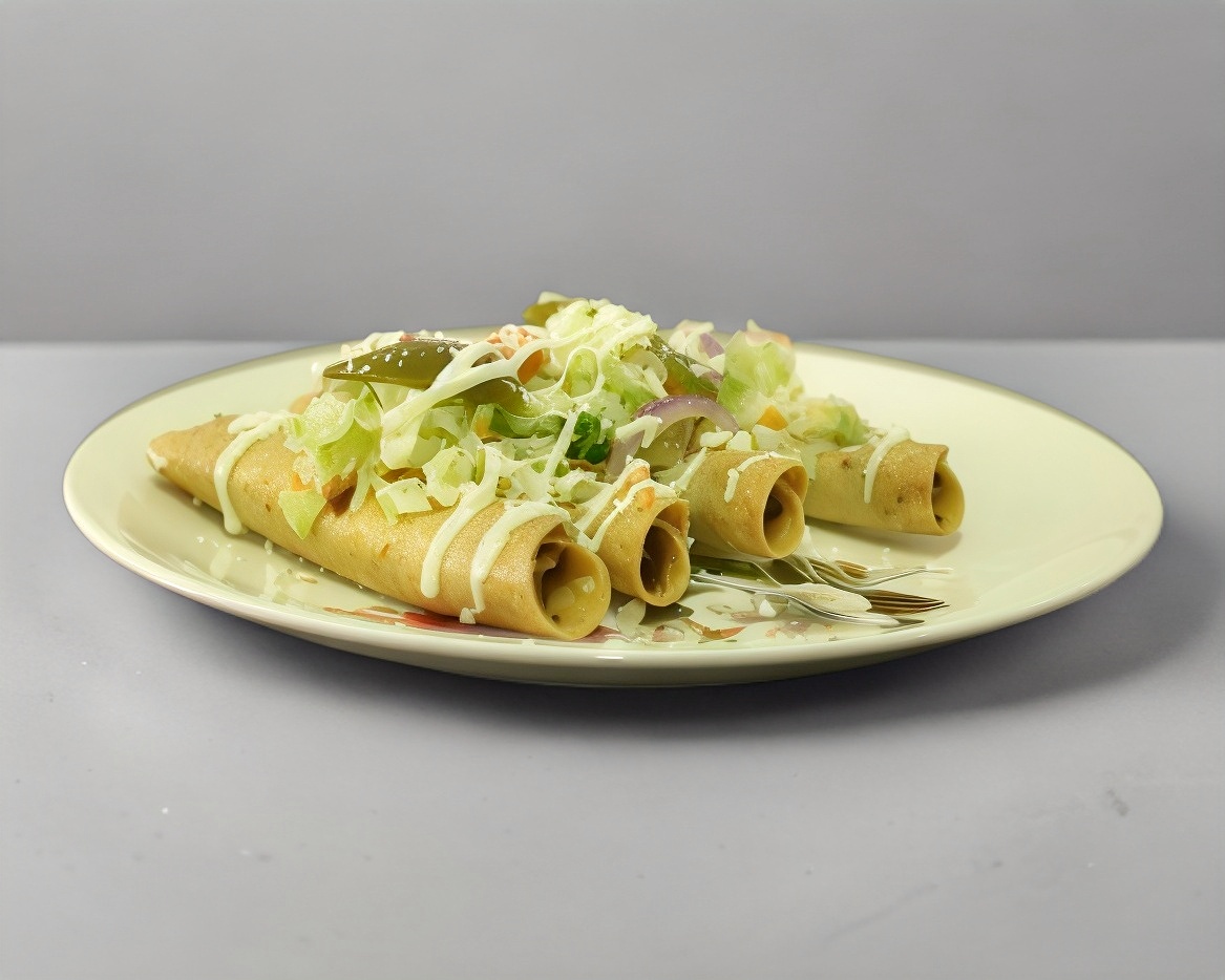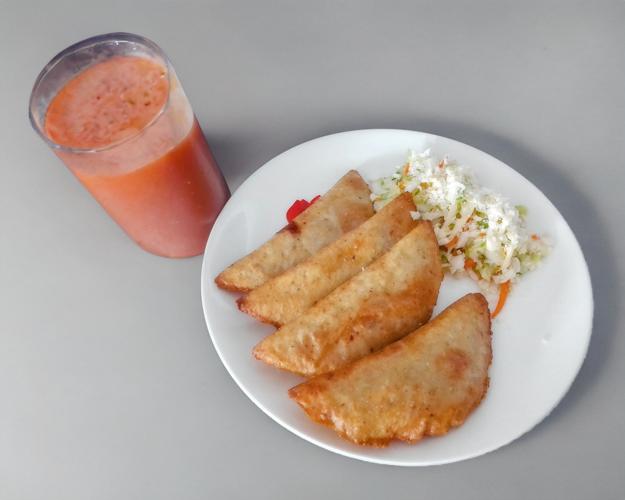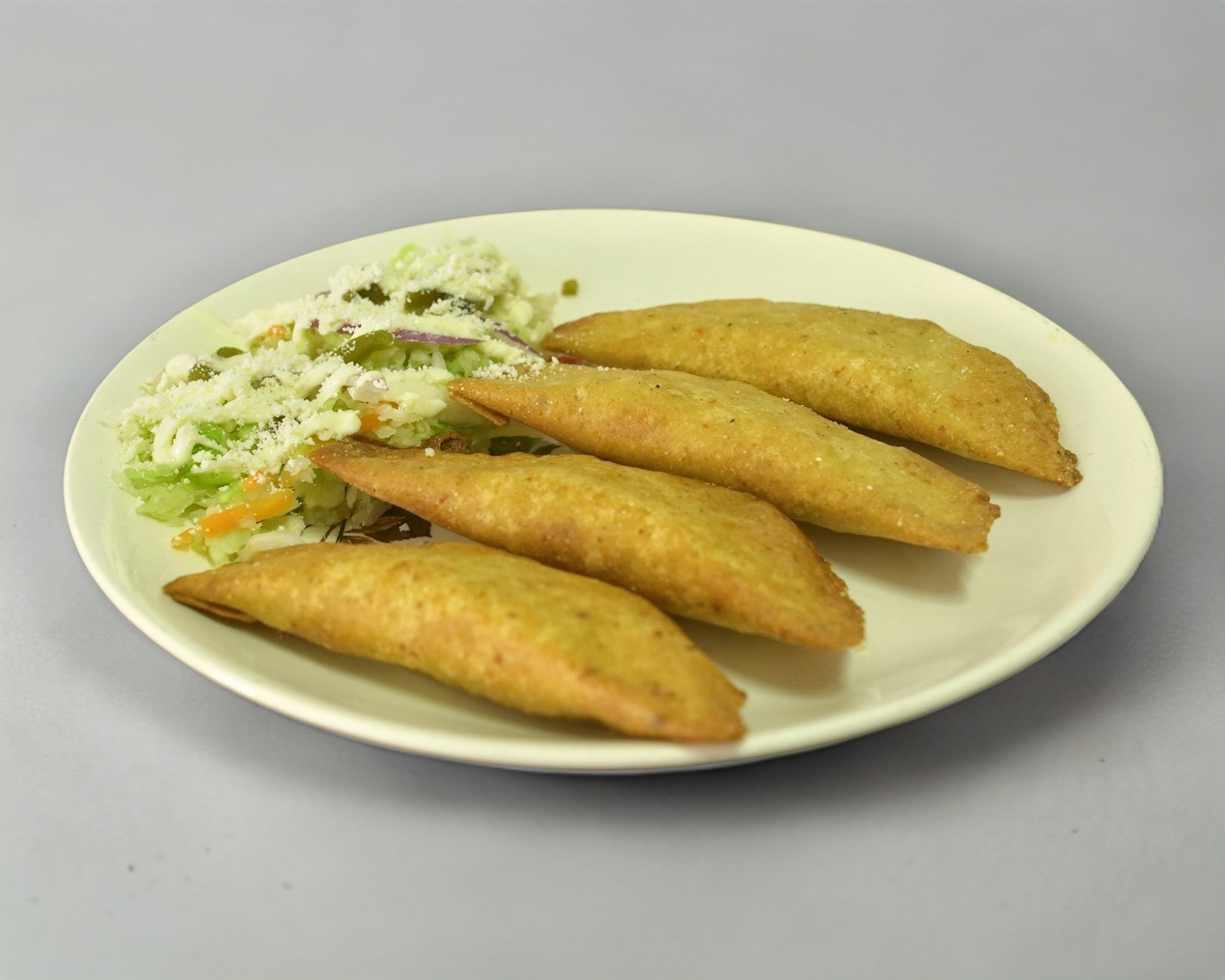 Deliciosas empanada de Pollo guisado con papa molida + ensalada repollo, zanahoria, crema , queso y salsa roja a base de tomate y chile habanero, 4 Piezas
