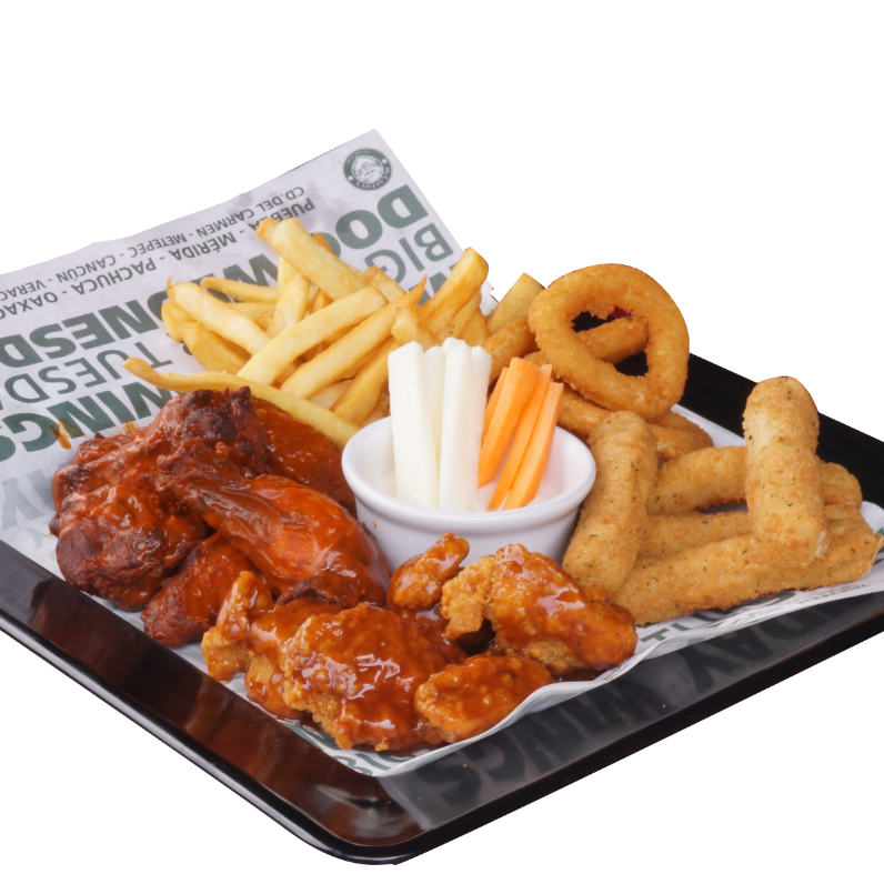 10 Alitas con 2 salsas a elegir, 10 boneless con 2 salsa a elegir, 6 aros de cebolla, 300 gramos de papas gajo + 1 blue cheese.