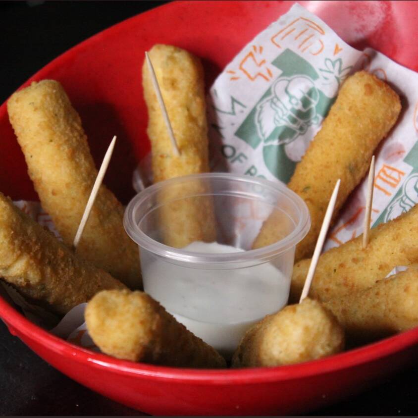 6 Dedos de queso mozzarella empanizados, acompañados de aderezo blue cheese.