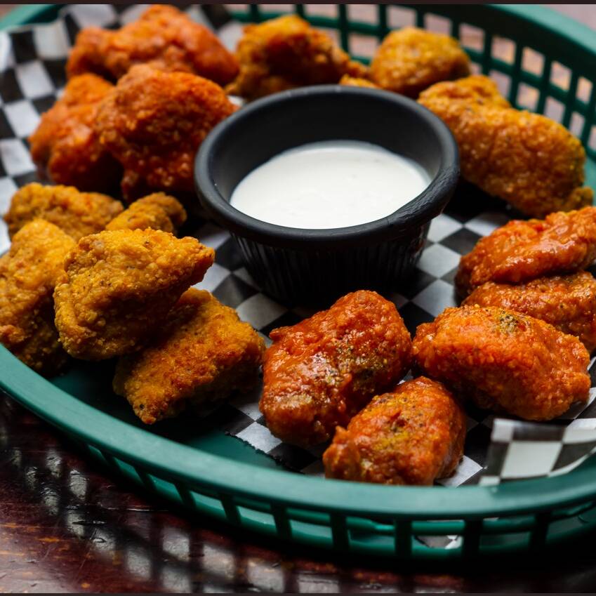 Trozos de pechuga empanizados (30 pza), bañado en 2 salsas de tu elección.