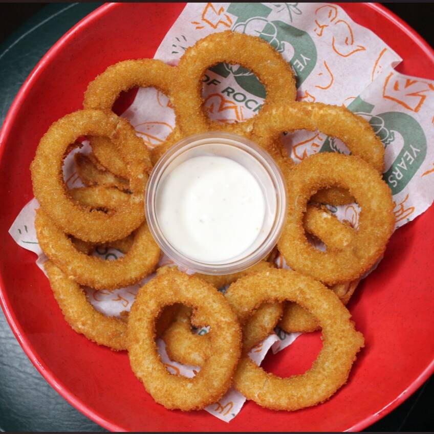 12 Crujientes aros de cebolla con aderezo blue cheese.