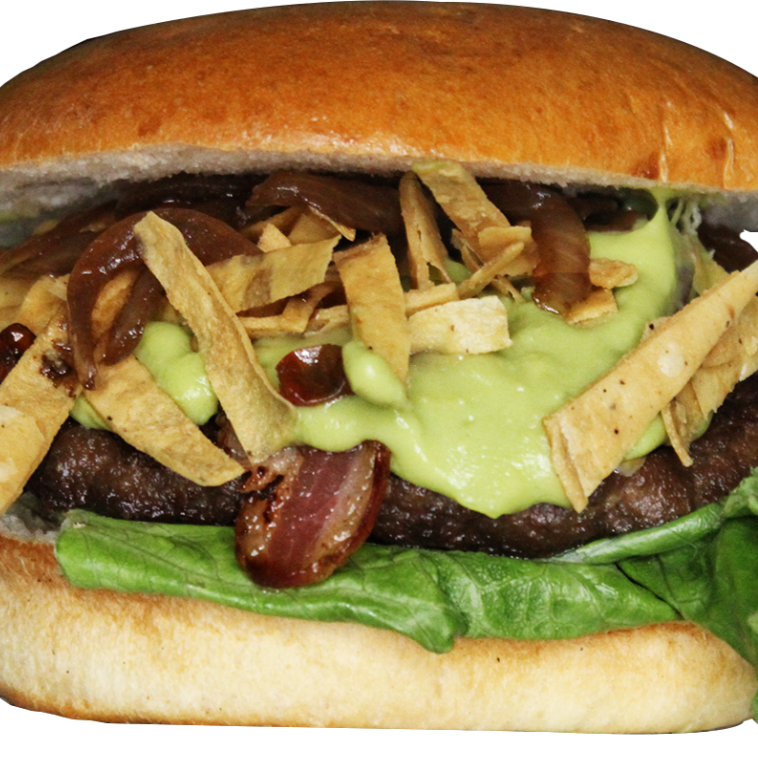 Hamburguesa de 220 gr de carne de res, pan artesanal con semillas, guacamole, totopos, chile, cebolla caramelizada, mayonesa, lechuga, mostaza y catsup. Incluye porción de papas clasicas.