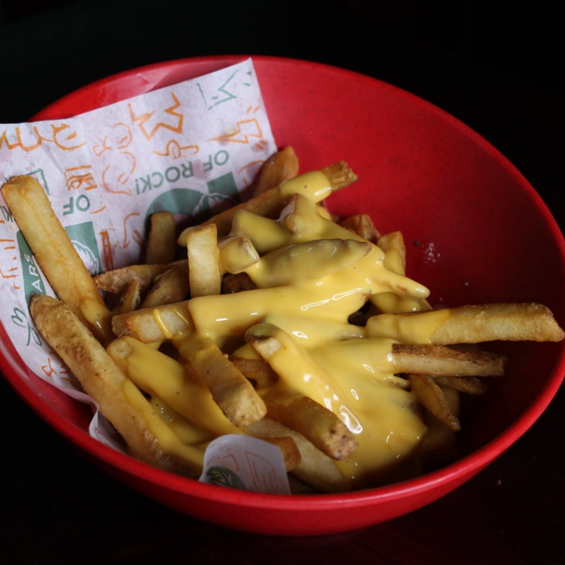 Papas fritas con queso Cheddar, porción de 350 gr.