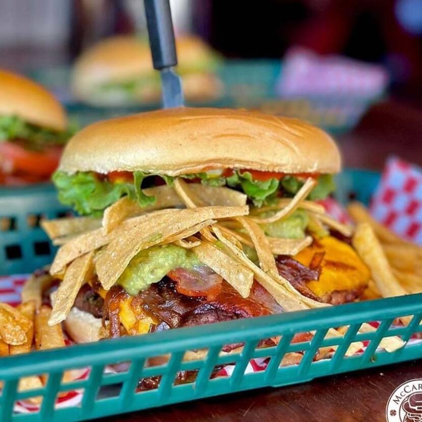 Hamburguesa de 220 gr de carne de res, pan artesanal con semillas, guacamole, totopos, chile, cebolla caramelizada, mayonesa, lechuga, mostaza y catsup. Incluye porción de papas clasicas.