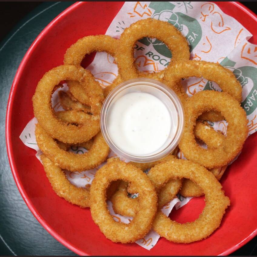 12 Crujientes aros de cebolla con aderezo blue cheese.