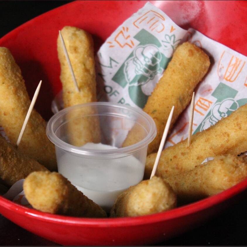6 Dedos de queso mozzarella empanizados, acompañados de aderezo blue cheese.
