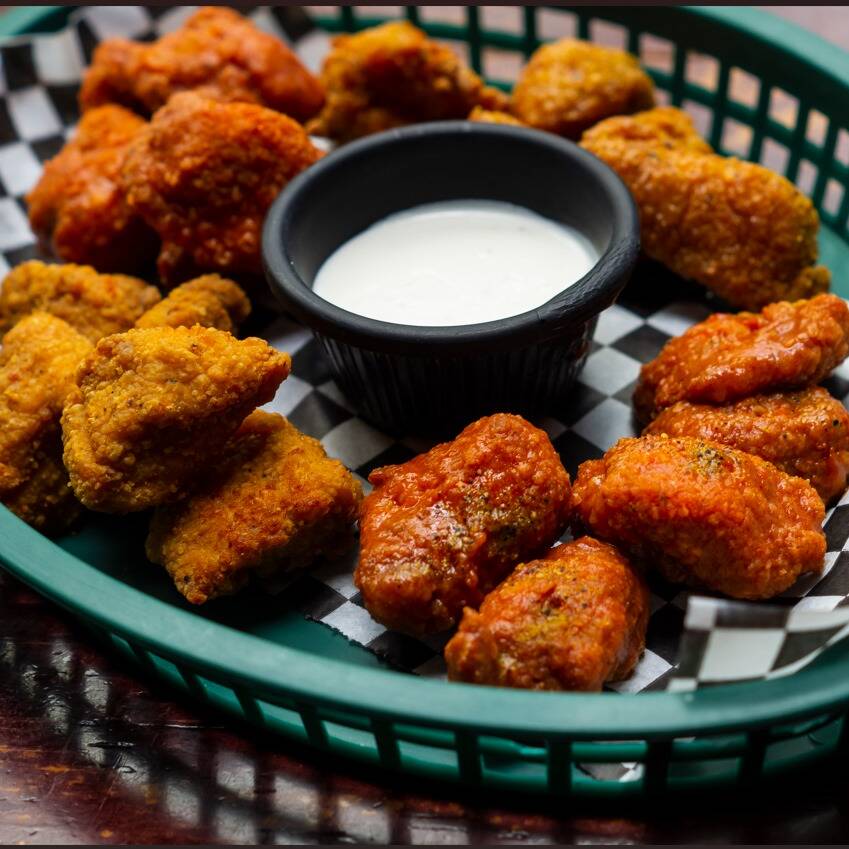 Trozos de pechuga empanizados (30 pza), bañado en 2 salsas de tu elección.
