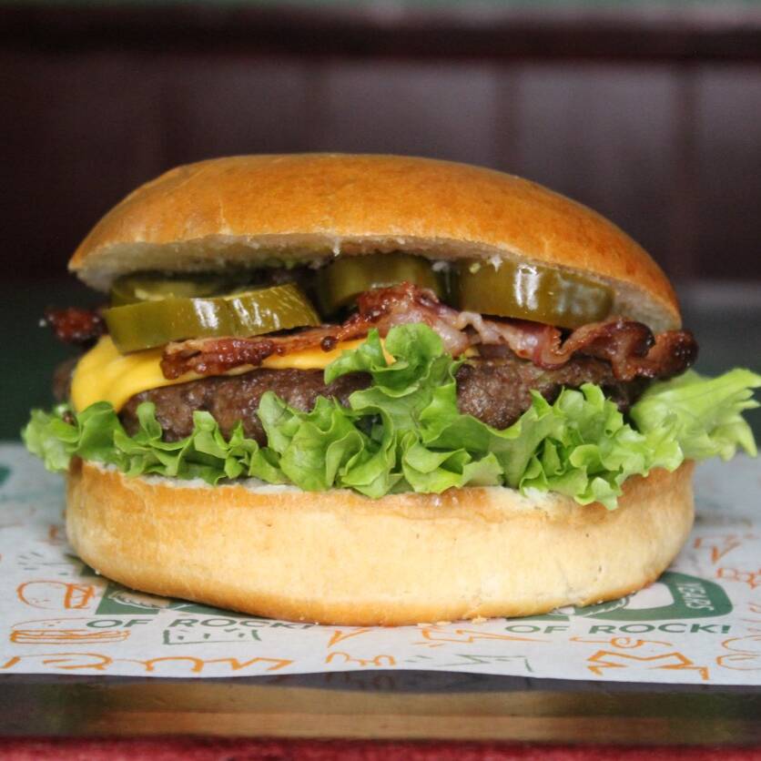 Hamburguesa de carne de res 80 gramos, receta del abuelo mccarthys, lechuga, fresca, cebolla, queso amricano y aderezo de pepinillos.