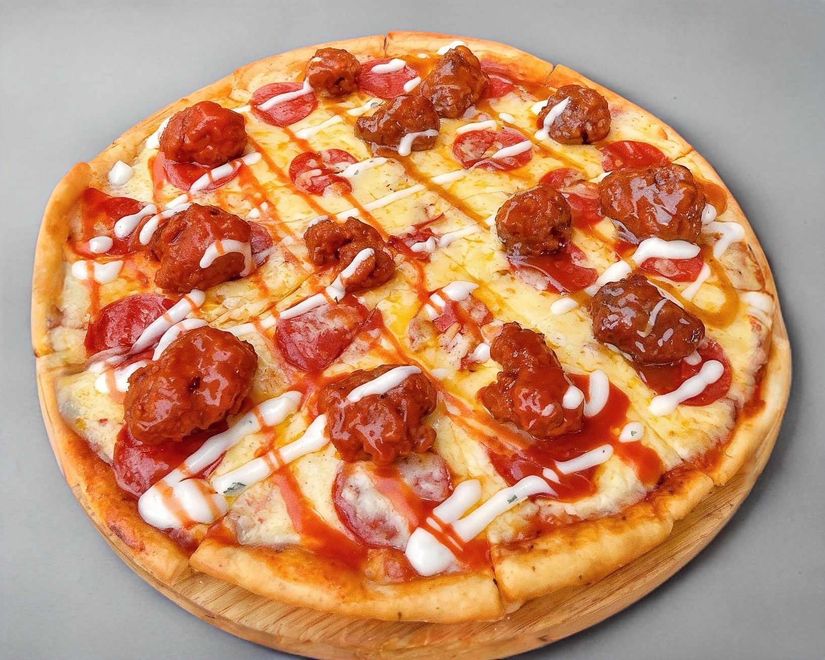 Pizza mediana 8 rebanadas: peperoni, boneless bañados en tu salsa favorita y salsa ranchera de la casa