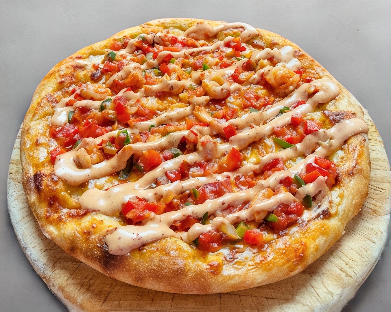 Pizza mediana 8 rebanadas: camarones salteados en mantequilla con tomate, cebolla, pimientos, jalapeño, bañada en aderezo cremoso de chipotle