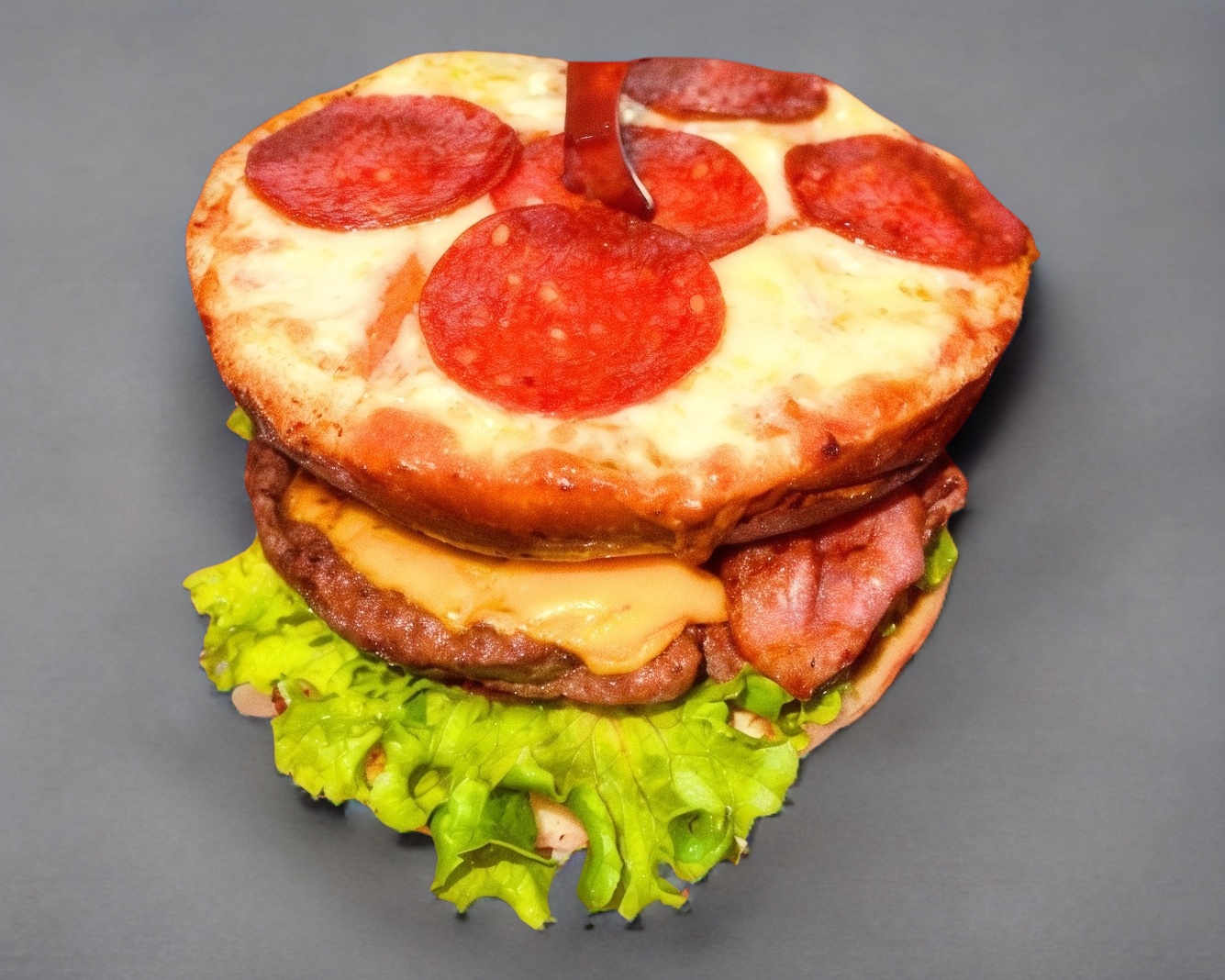 6 oz de jugosa carne angus, doble queso americano, salsa pomodoro, tocino ahumado, vegetales, y en la tapa: salsa pomodoro, queso gouda, peperoni y chimichurri.