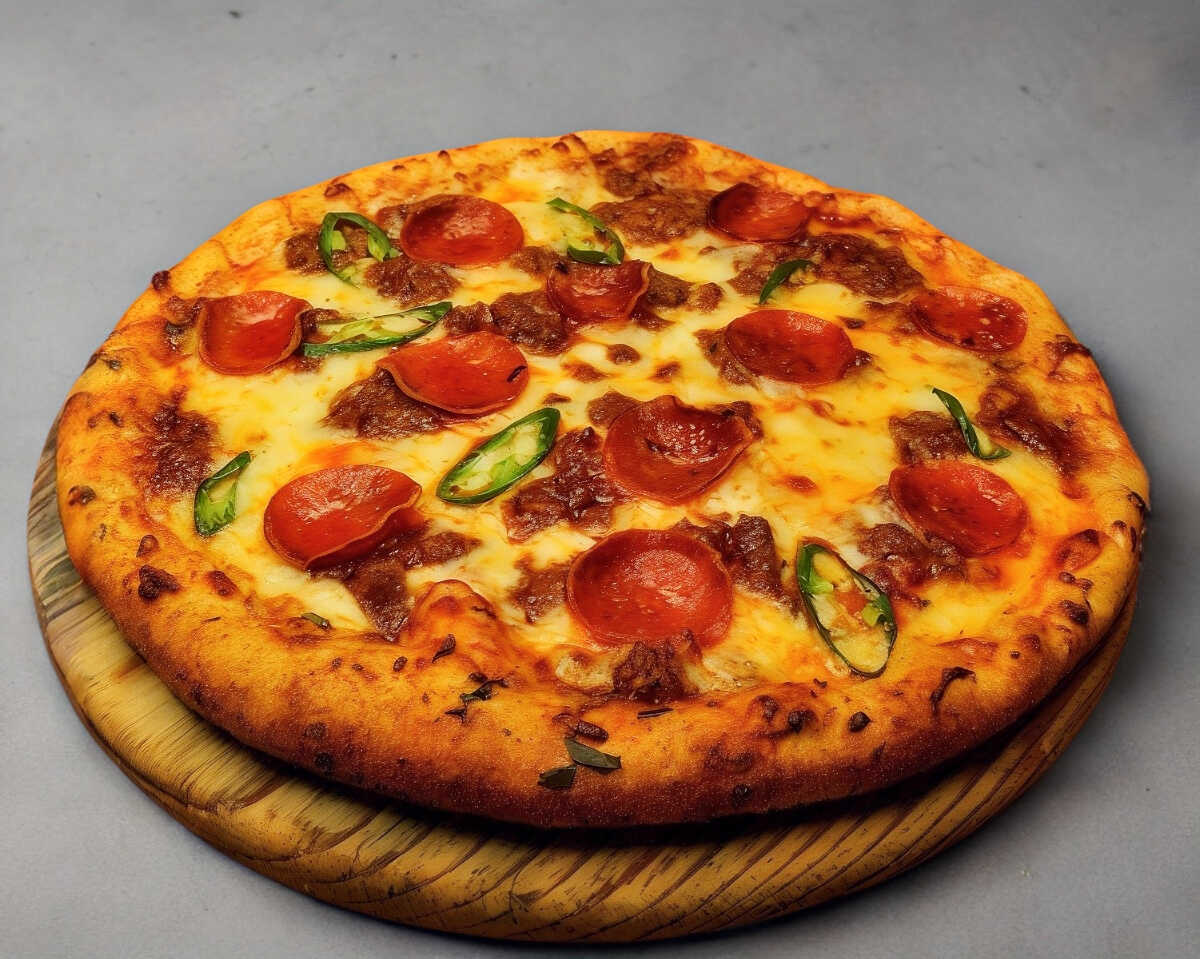 Pizza mediana 8 rebanadas con chilibeans peperoni y jalapeños.