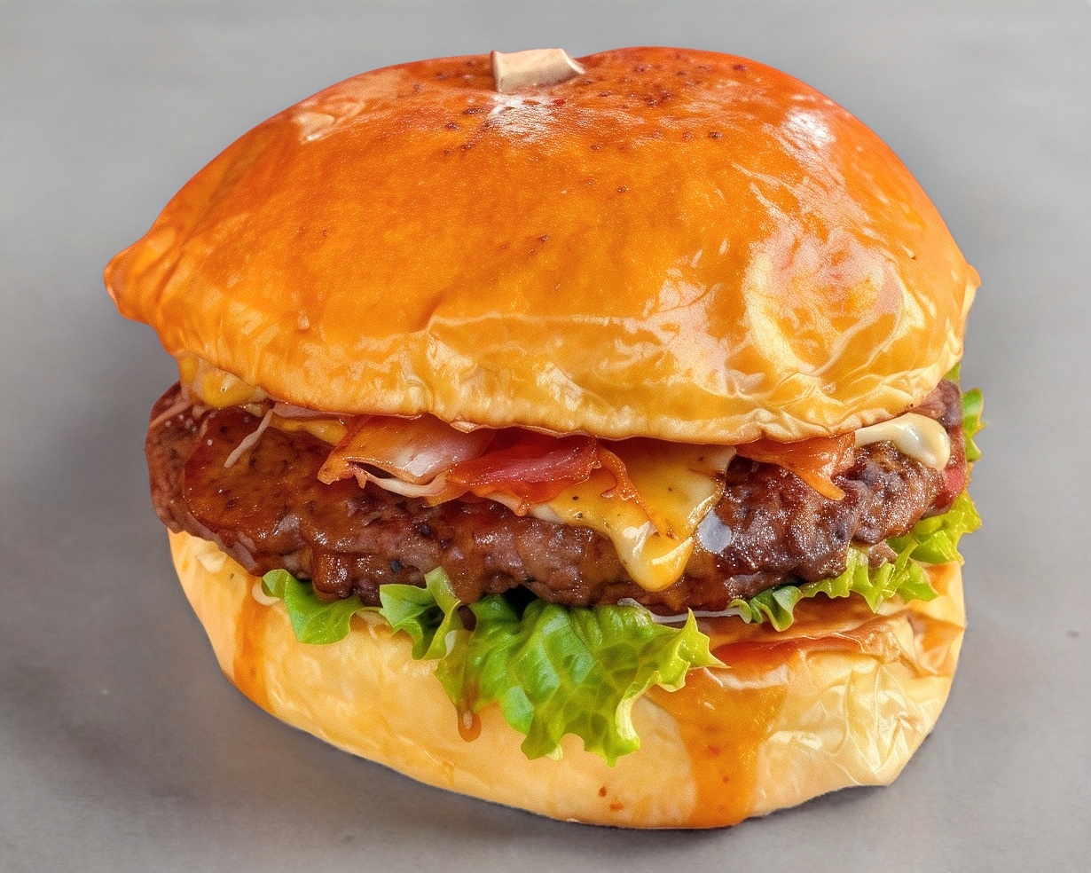 6 oz de jugosa carne angus, doble queso americano, mermelada de tocino, doble tocino ahumado, aros de cebolla crispi, aderezo de chipotle y pepinillos.