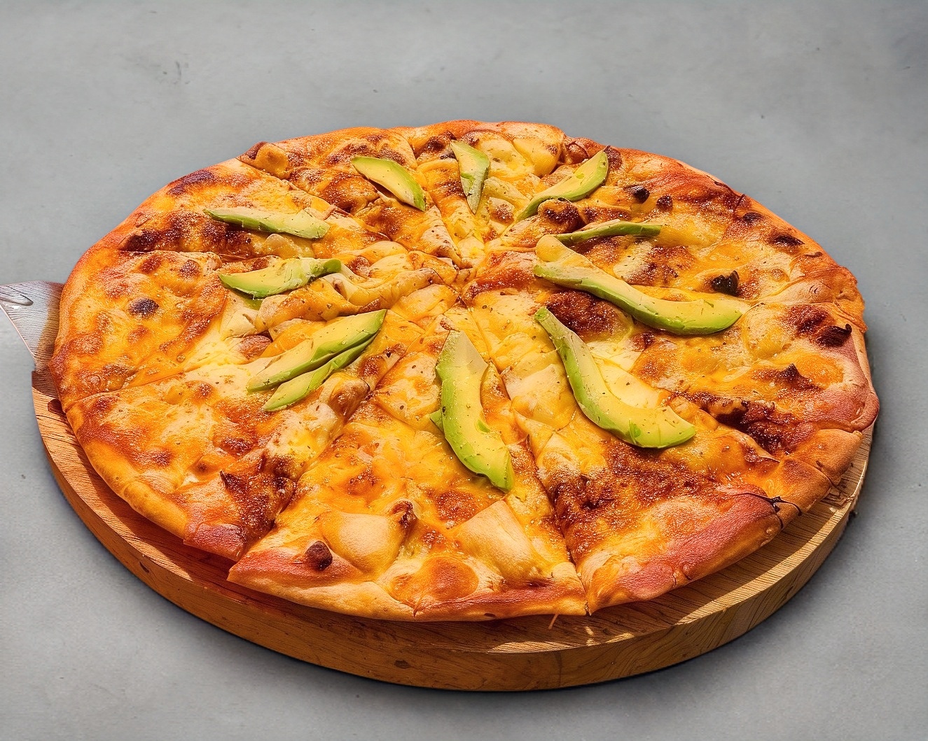 Pizza grande de 10 rebanadas: chorizo, elote, tocino ahumado, cebolla y aguacate y mezcla de quesos.