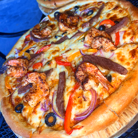 Pizza grande 10 rebanadas: arrachera, camarones, pimientos, cebolla morada, aceitunas negras y mezcla de quesos.