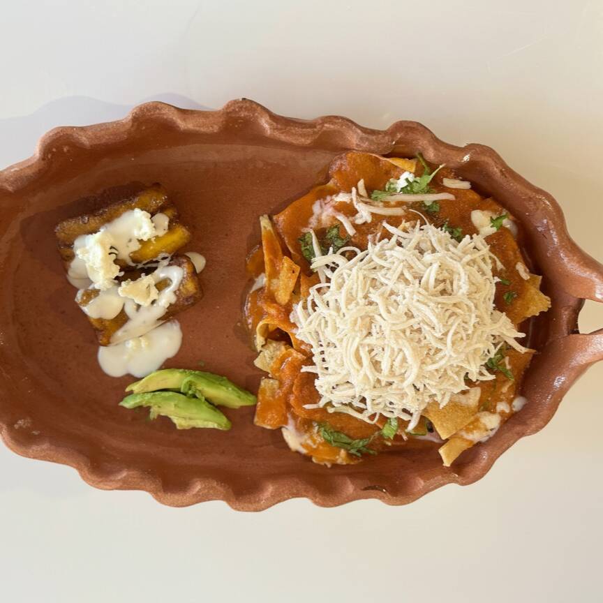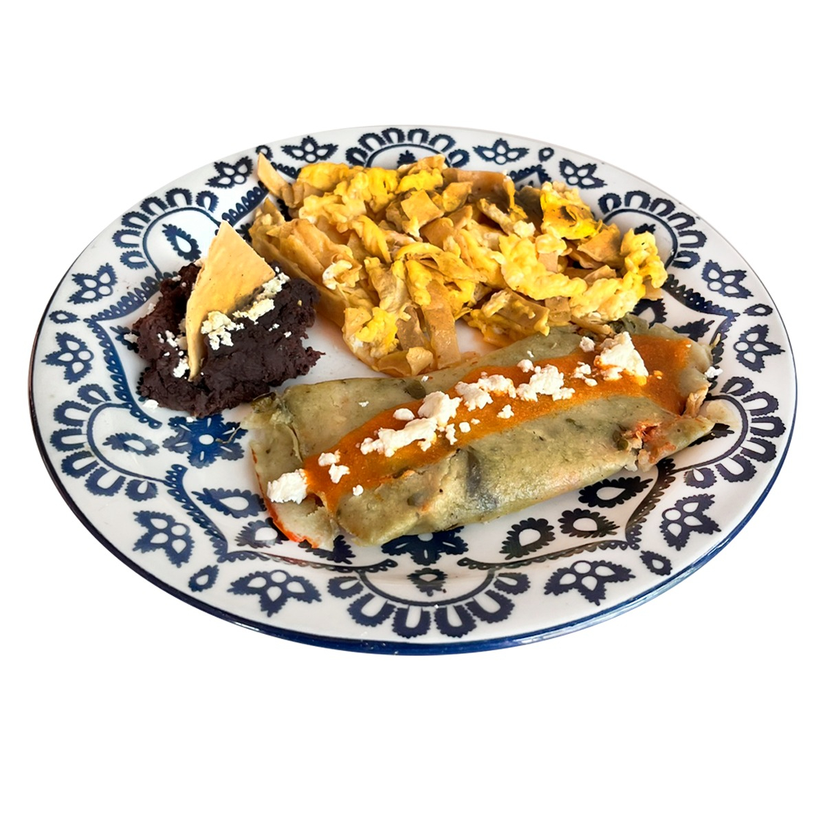 Relleno de queso Chiapas, chorizo 80gr., hojas de chipilín, acompañado de frijoles, chilaquiles y plátanos fritos.