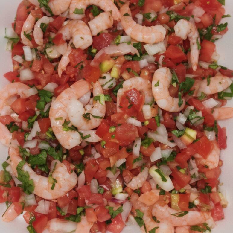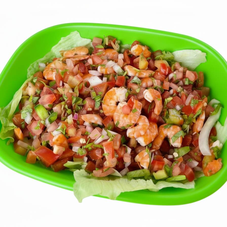 Delicioso Ensalada elaborada con 250 gr. de pulpa de camarón con tomate, cebolla, cilantro y chile verde