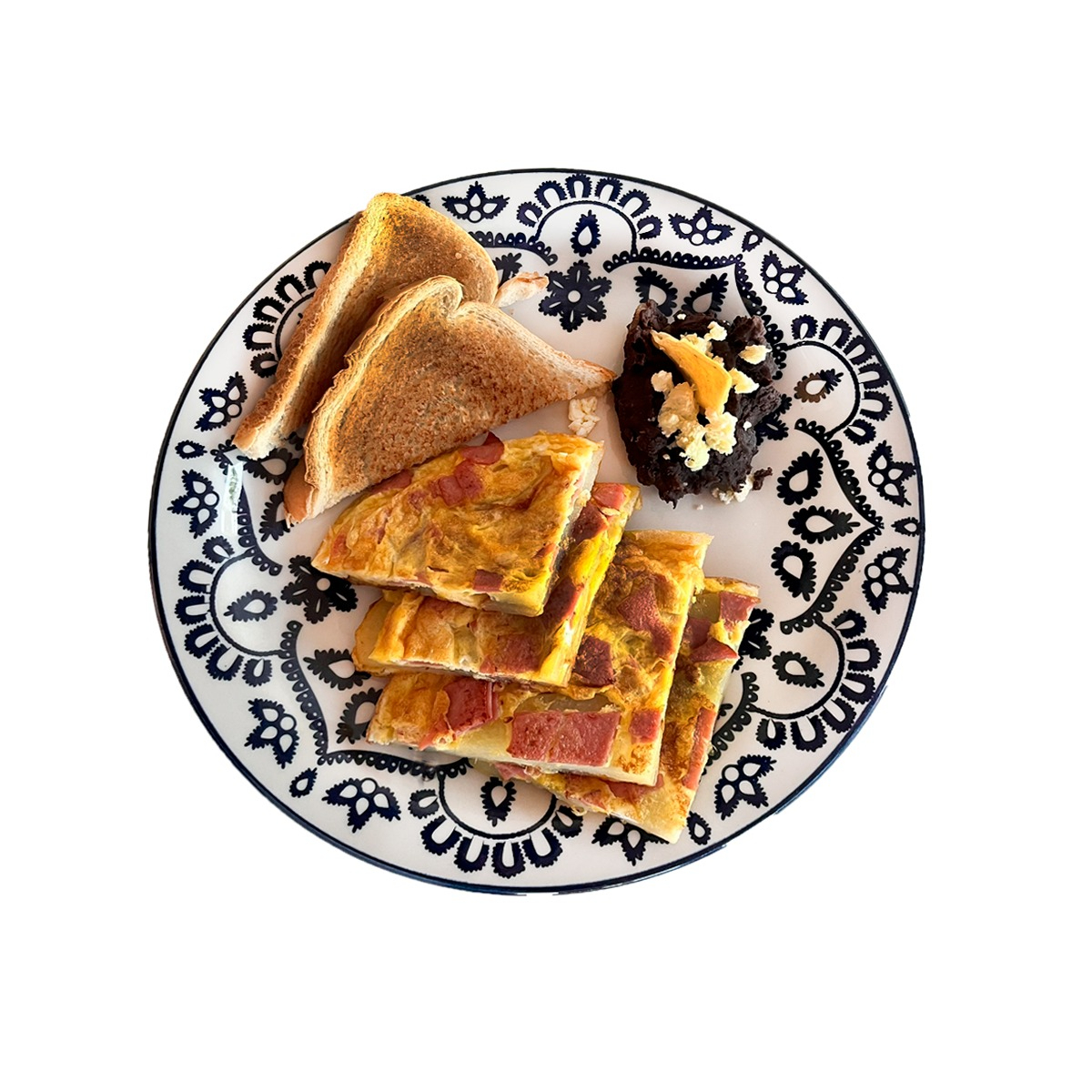 Tortilla de huevo 2pz. con papa y tocino, acompañados de pan tostado y frijoles refritos.