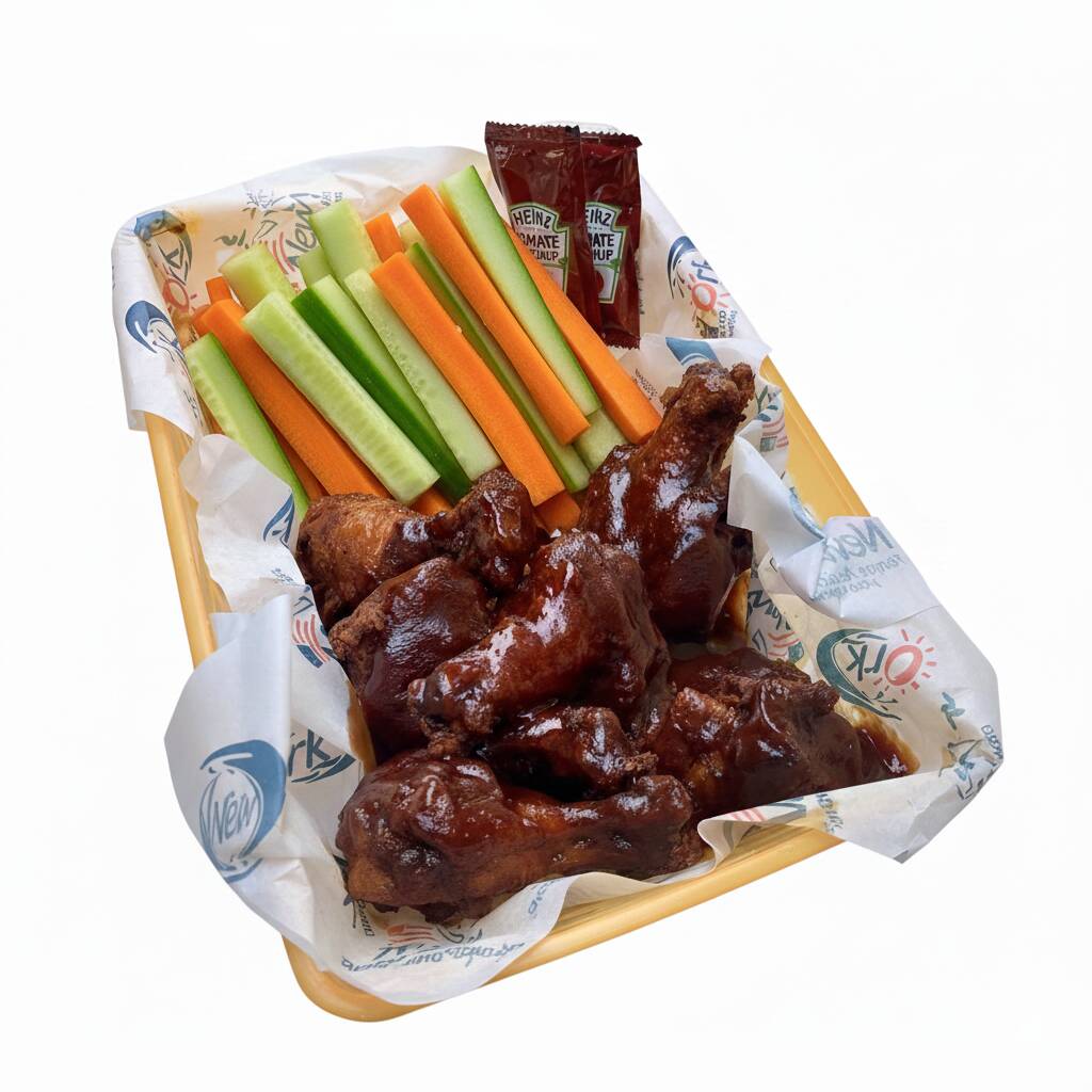 Alitas de pollo jugosas bañadas en salsa BBQ o búfalo, con el equilibrio perfecto entre sabor ahumado o picante. Se sirven acompañadas de bastones frescos de pepino y zanahoria, junto con cremoso aderezo ranch que complementa cada bocado.