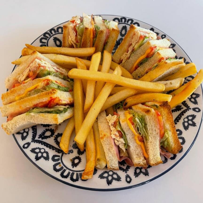 Delicioso club sandwich acompañado de papas a la francesa y refresco