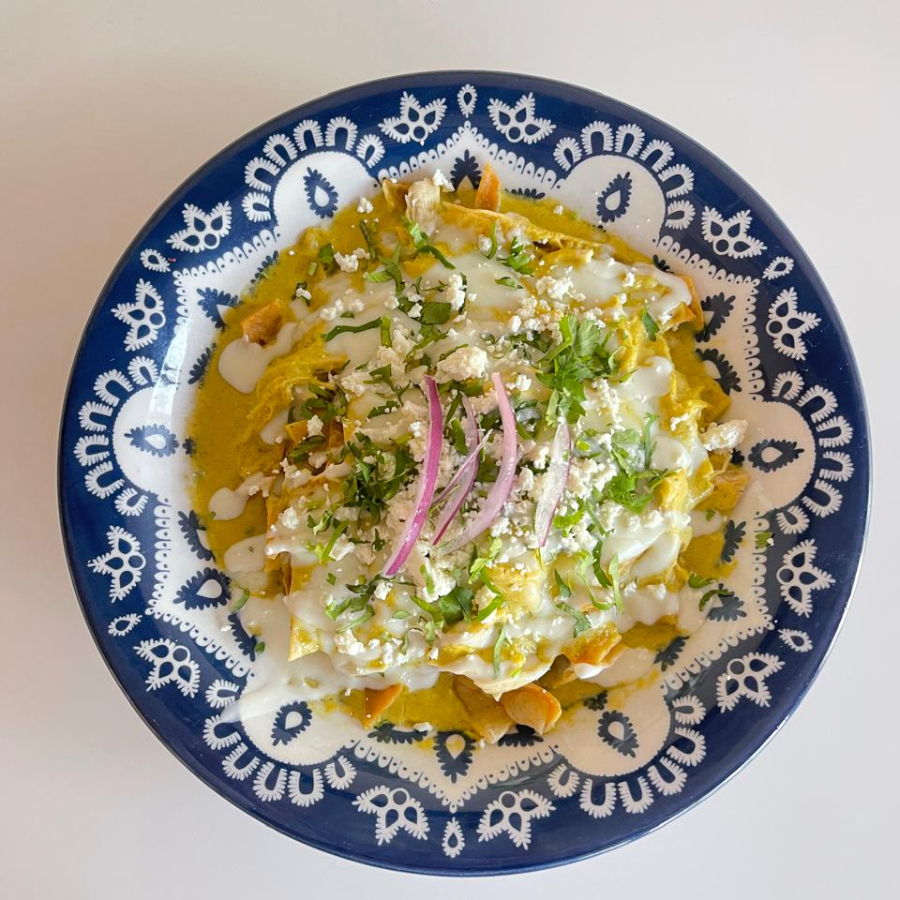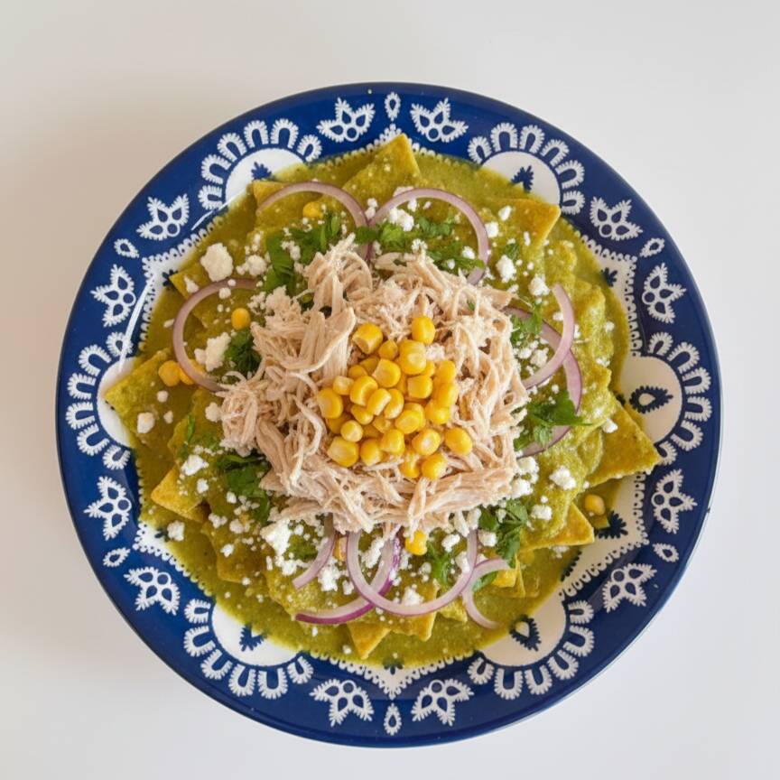 Deliciosos Chilaquiles en crema de poblano con pechuga deshebrada 120gr., y granos de elote