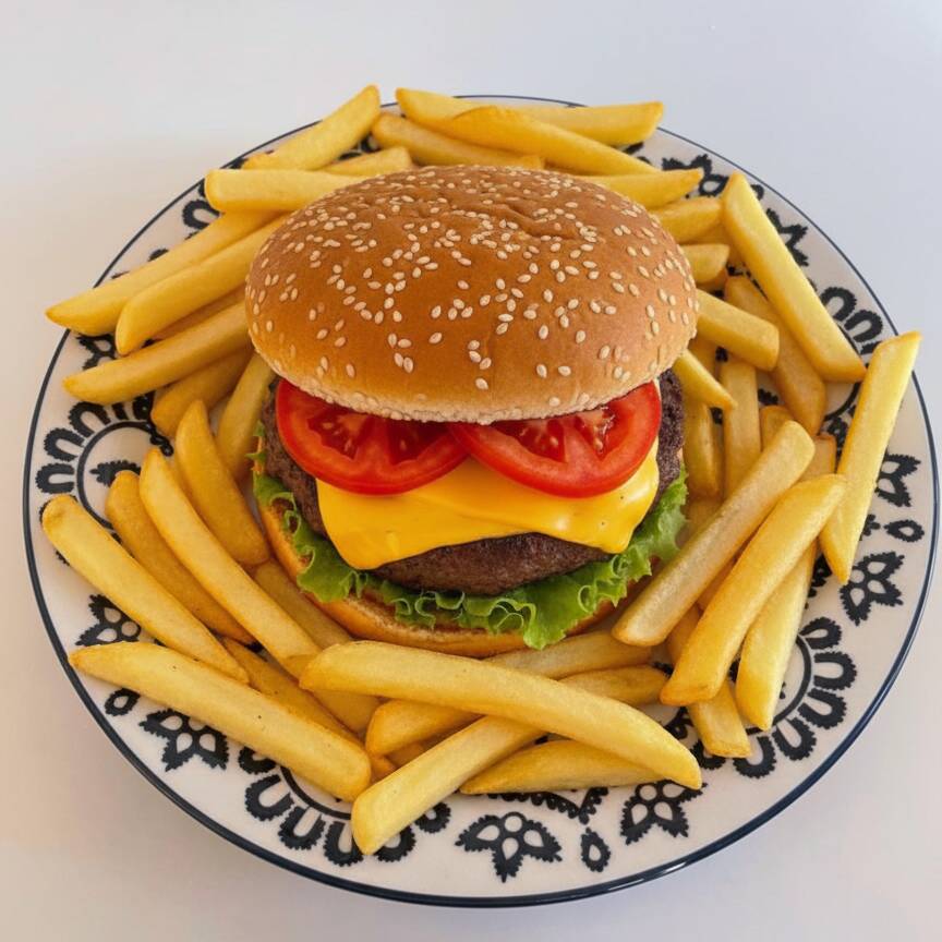 Deliciosa hamburguesa de carne arrachera acompañado de papas a la francesa y refresco