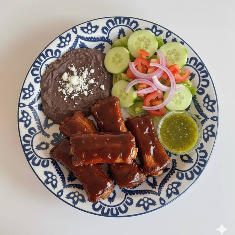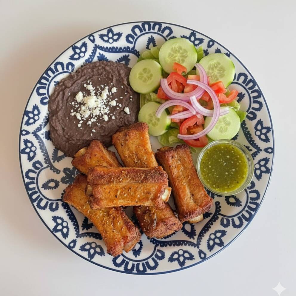 Jugosas costillitas de cerdo fritas (250 gr.) al punto perfecto, doradas por fuera y suaves por dentro, con un sabor intenso y casero. Se sirven acompañadas de ensalada fresca, frijoles refritos y una deliciosa salsa que realza cada bocado.