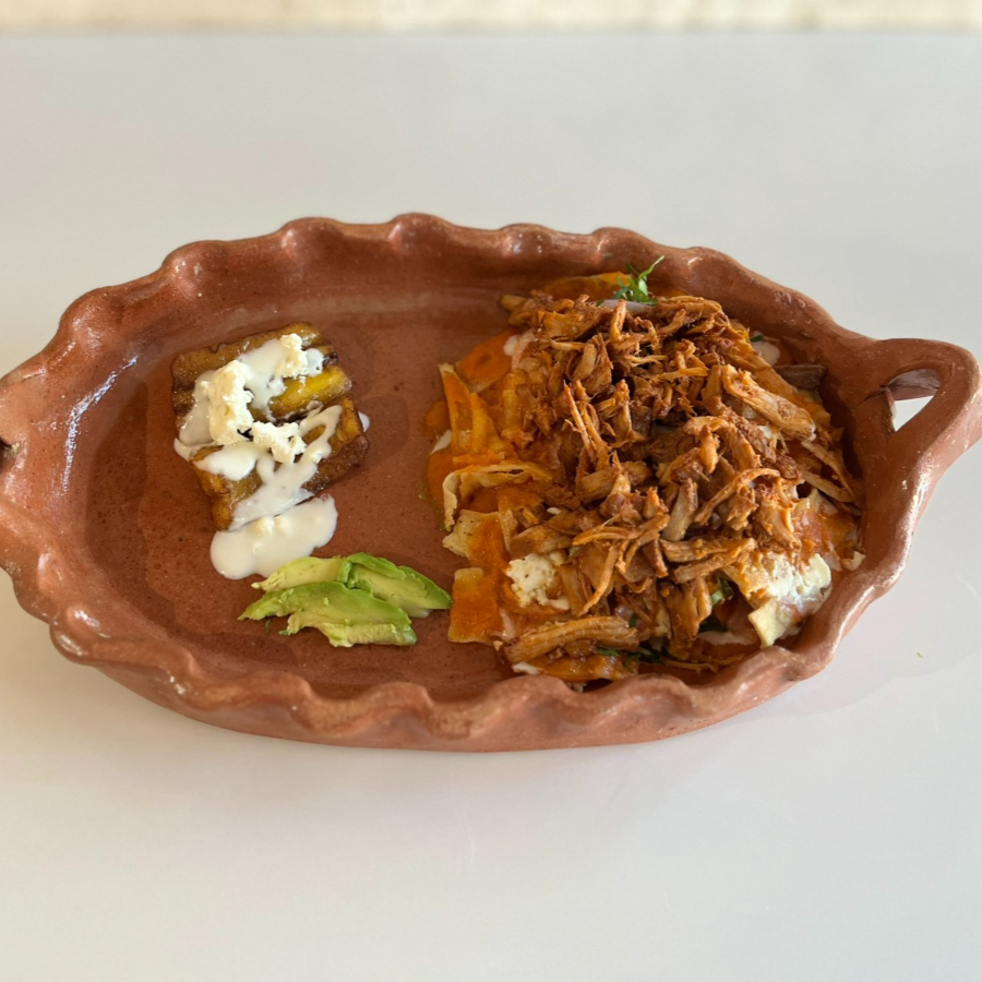 Deliciosos chilaquiles en salsa suiza con pechuga de pollo deshebrada 120gr., y gratinados