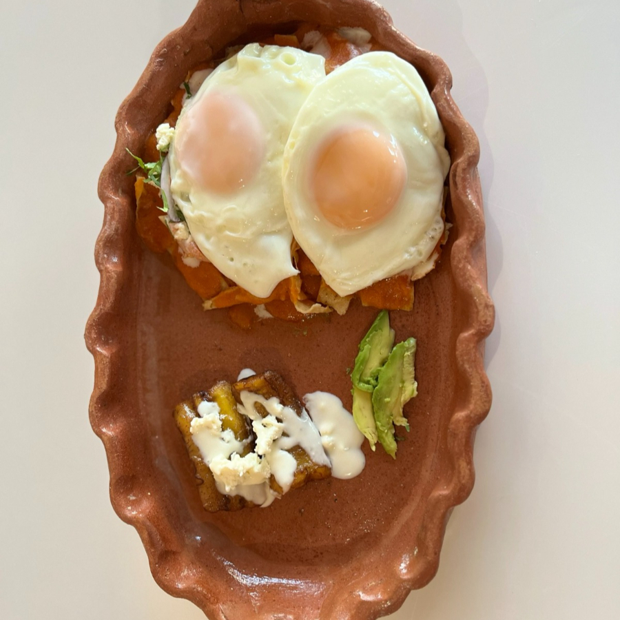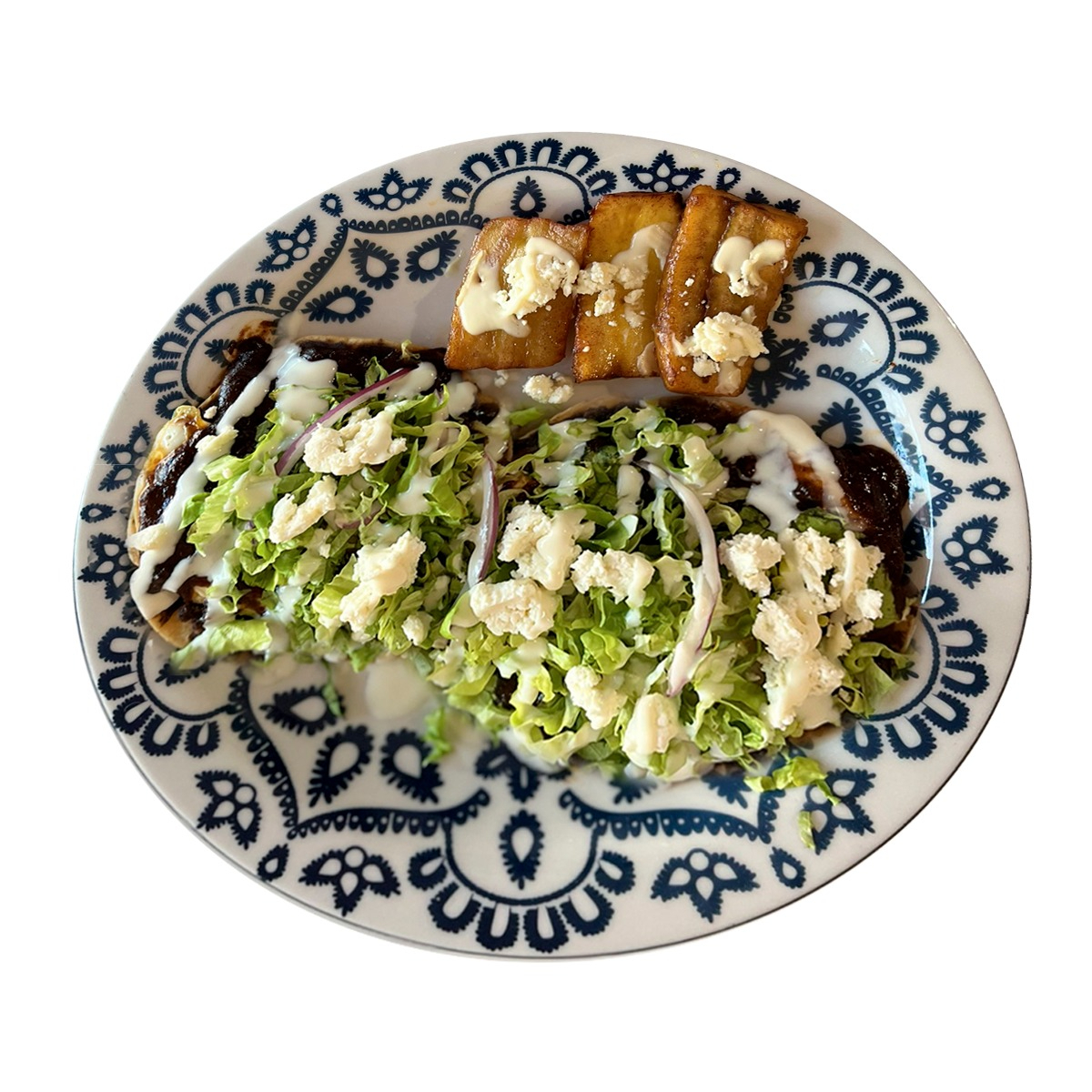 Huevos 2pz. estrellados o revueltos, sobre tostadas bañadas con mole, acompañados de plátanos fritos.